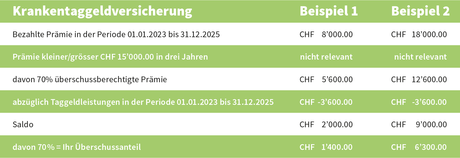Die Prämiensätze bei der Visana liegen bei schadenfreiem Verlauf des Vertrags je nach Wartefrist zwischen 30 und 40% unter dem Marktdurchschnitt. Die Verträge der Visana haben kein Bonus-/Malus-System. Das heisst, während der Vertragsdauer von drei Jahren wird der Prämiensatz garantiert und eine Anpassung an den Schadenverlauf erfolgt erst nach Ablauf dieser Periode. Die Visana bietet eine gesamtarbeitsvertragskonforme Deckung mit einer Wartefrist pro Person und Kalenderjahr (und nicht pro Person und Krankheitsfall). Nach einer Beobachtungsperiode von drei Jahren vergütet die Visana eine Überschussbeteiligung von 70%. Dazu folgendes Beispiel:
