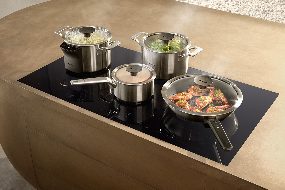 L’assortiment comprend des plans de cuisson de 60, 80 et 90 centimètres de large, avec des zones définies ou une induction pleine surface, sans cadre ou avec un cadre en inox. De nombreux modèles peuvent être utilisés avec M Sense et des récipients de cuisson conventionnels, ou sont “M Sense ready”. La fonction éprouvée Con@ctivity apporte un confort supplémentaire : si les appareils sont en réseau, la hotte aspirante réagit dès que le plan de cuisson est allumé ou éteint et gère automatiquement la puissance de ventilation. L’impression du plan de cuisson* a été réduite au minimum afin qu’elle disparaisse lorsque l’appareil est éteint – et il s’intègre ainsi harmonieusement dans les cuisines ouvertes.
